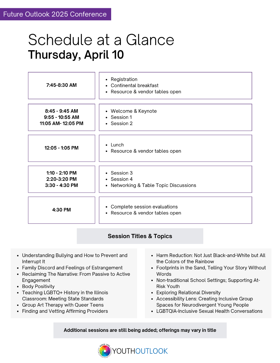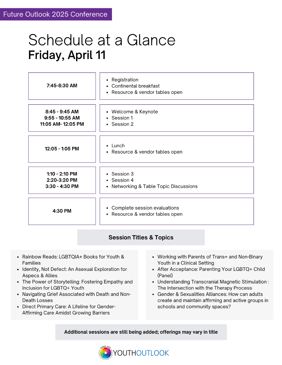 The Future Outlook 2025 Conference will feature keynote speakers, tracked breakout sessions by profession, and professional education credits: CEU, CPDU, or CME for all attendees. The event is tailored to the professional development needs of educators, mental and physical health practitioners, and social service providers working with LGBTQ+ young people and their families. All attendees will be provided continental breakfast and lunch for each day of the conference.